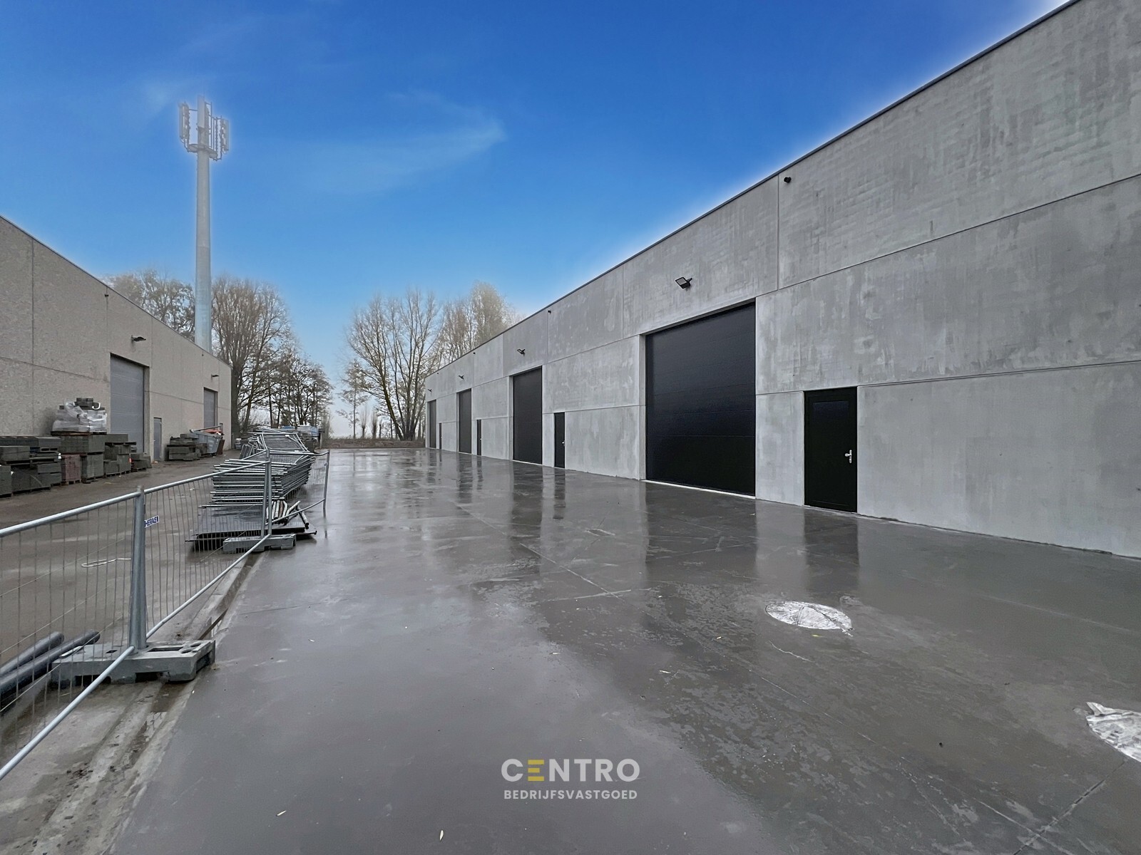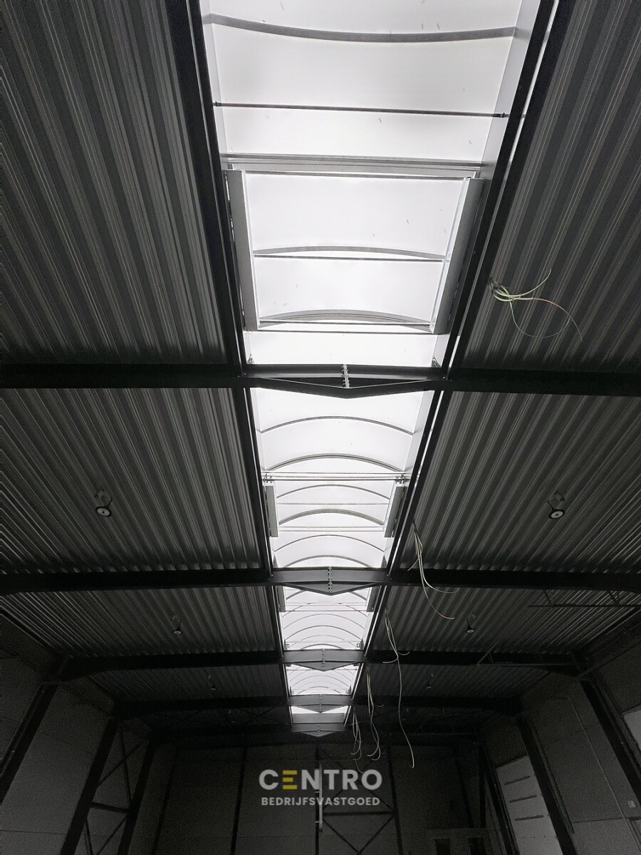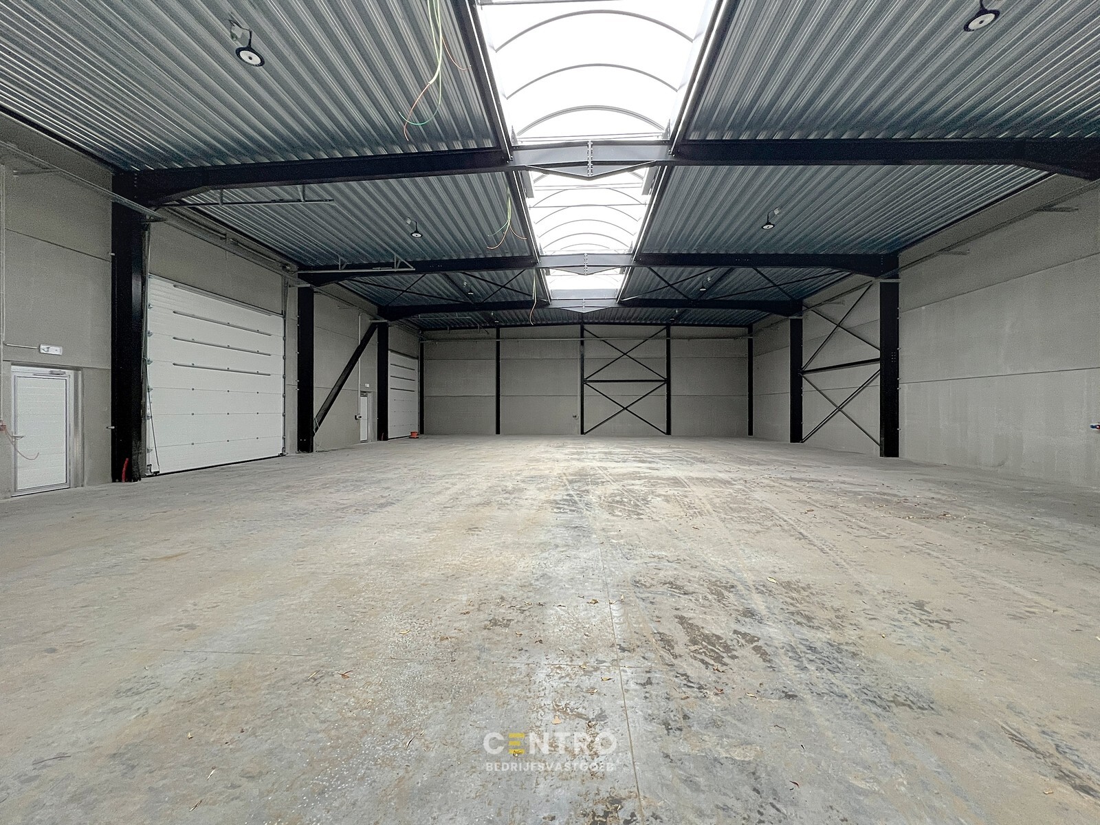 Solide metaalconstructie met betonpanelen - volledige overspanning - gepolierde betonvloer - vrije hoogte: 7m - geïsoleerd plat dak (steeldeck) met centrale lichtstraat - 4 elektrische sectionaalpoorten (b: 4,5m x h: 4,5m) met aparte loopdeuren - buitenverlichting boven de poorten - LED verlichting (16x) - noodverlichting boven de loopdeuren - 12 prise-blokken.