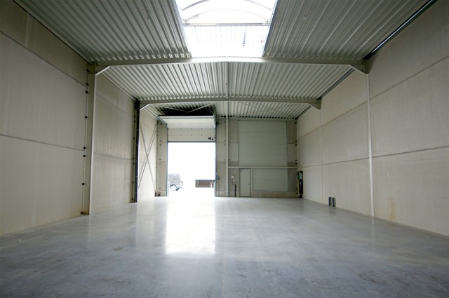 Metalen constructie met volledige overspanning (geen palen) -bevloering in gepolierde beton - wanden in cellenbeton - vrije hoogte: 6,2m, geïsoleerde elektrische sectionaalpoort (h: 4,3m; b: 4m) met stootpalen en afzonderlijke loopdeur (aluminium) - geïsoleerd plat dak (wit) met centrale lichtstraat - geïntegreerd rookluik en rookdetector.