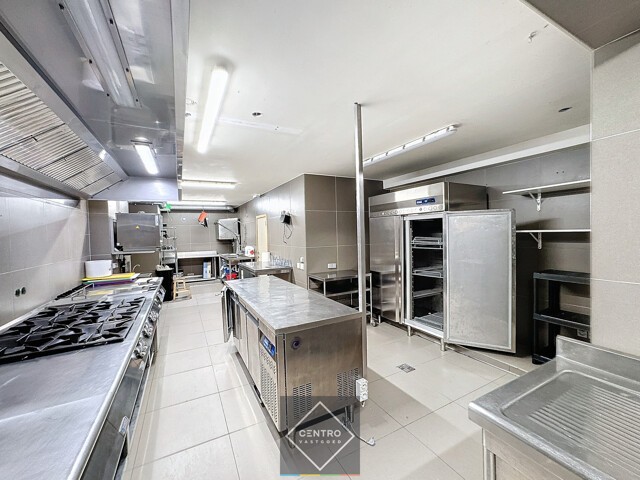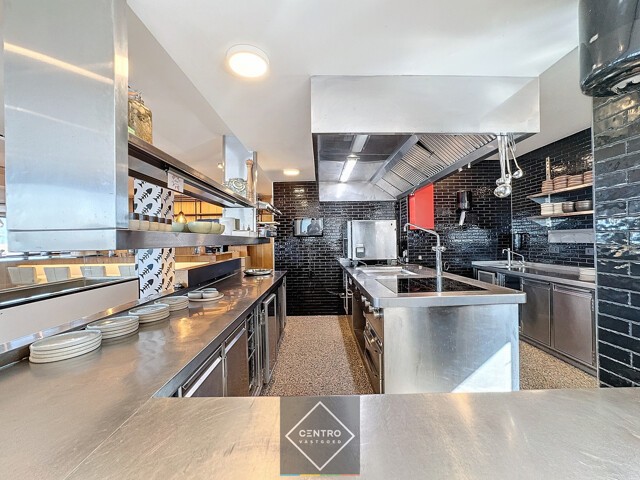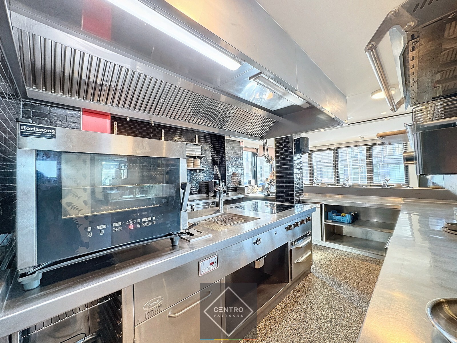 Gelijkvloers (± 240m²): Inkom met sas (warmte) - gelagzaal (voor 55-tal personen) - volledig geïnstalleerd industriële keuken in inox (inclusief alle ingebouwde toestellen van TOP-merken) - afgewerkte bar in met spoelbak, frigo's (inox), ... - een tweede warme industriële keuken - afwaszone - berging met koelcel - afzonderlijke ingang voor leveranciers (moeten niet door het restaurant!!!) - sanitaire ruimten (dames/heren/mindervaliden).