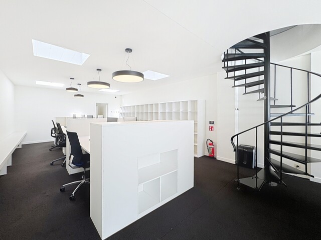 Eerste verdieping (± 50m²): Afzonderlijk bureel (1 werkplaats) - ruime vergaderzaal met trap naar de zolderverdieping.
