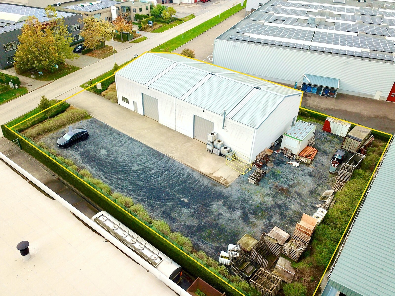 - Poorten: 2 elektrische sectionaalpoorten (h: 4,5m; b: 4m)