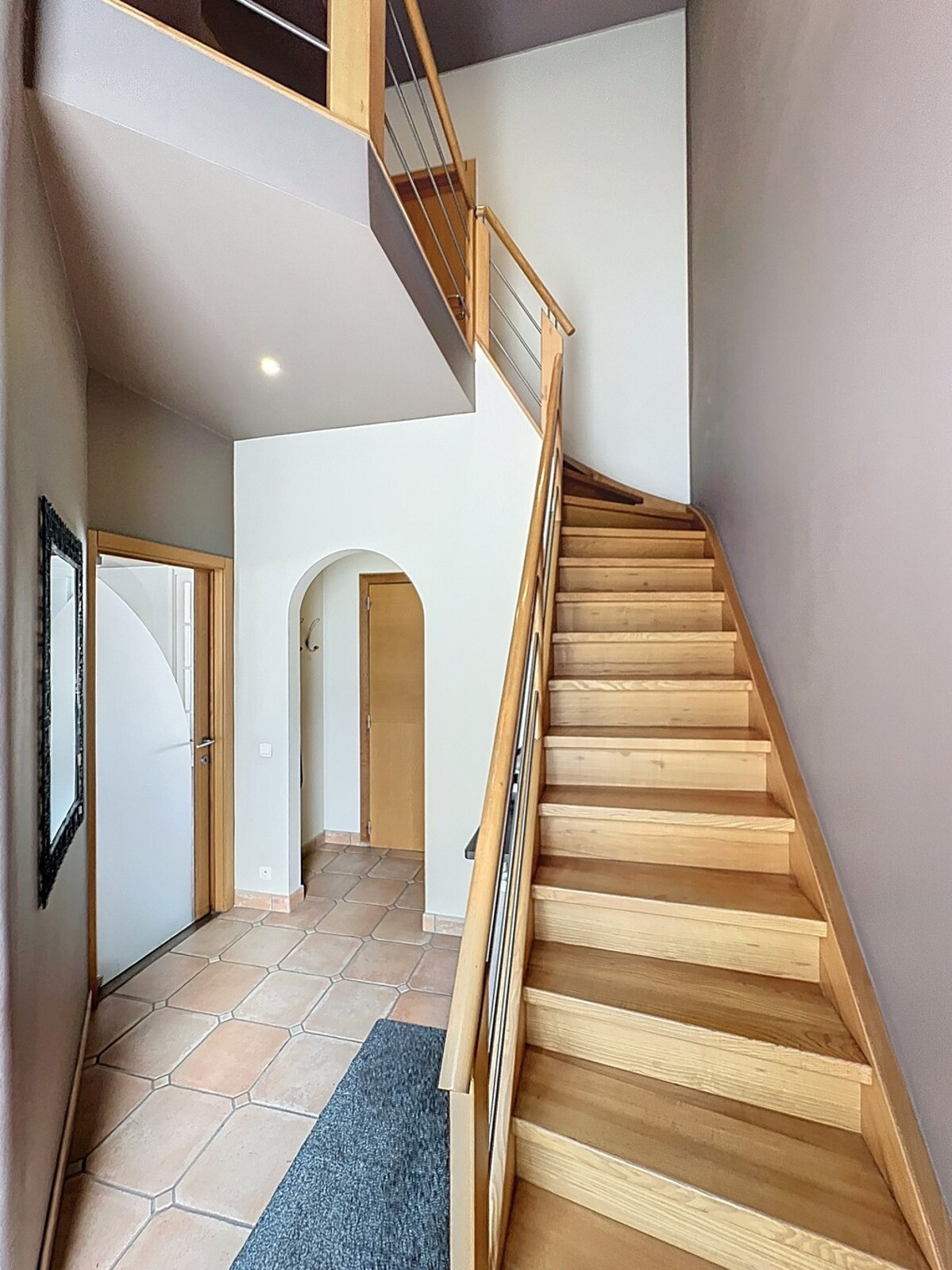 Tweede verdieping: Nachthal – toilet – badkamer (met ligbad, inloopdouche, wastafel met dubbele lavabo en spiegelkast) – 3 slaapkamers.