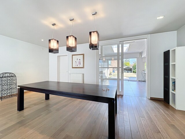 Gelijkvloers: Inkom met vestiairenis - ruim toilet met lavabo – lichtrijke leefruimte met verhoogde zithoek en met vrijstaande houtkachel - eetruimte - volledig geïnstalleerde L-vormige open leefkeuken met kookeiland (met alle toestellen, waaronder AEG inductiekookplaat, ingebouwde vaatwasser en koelkasten, dampkap, oven, microgolf ) - aparte keukenberging - wasplaats met uitgietbak - tuin met terrassen en ruime tuinberging.