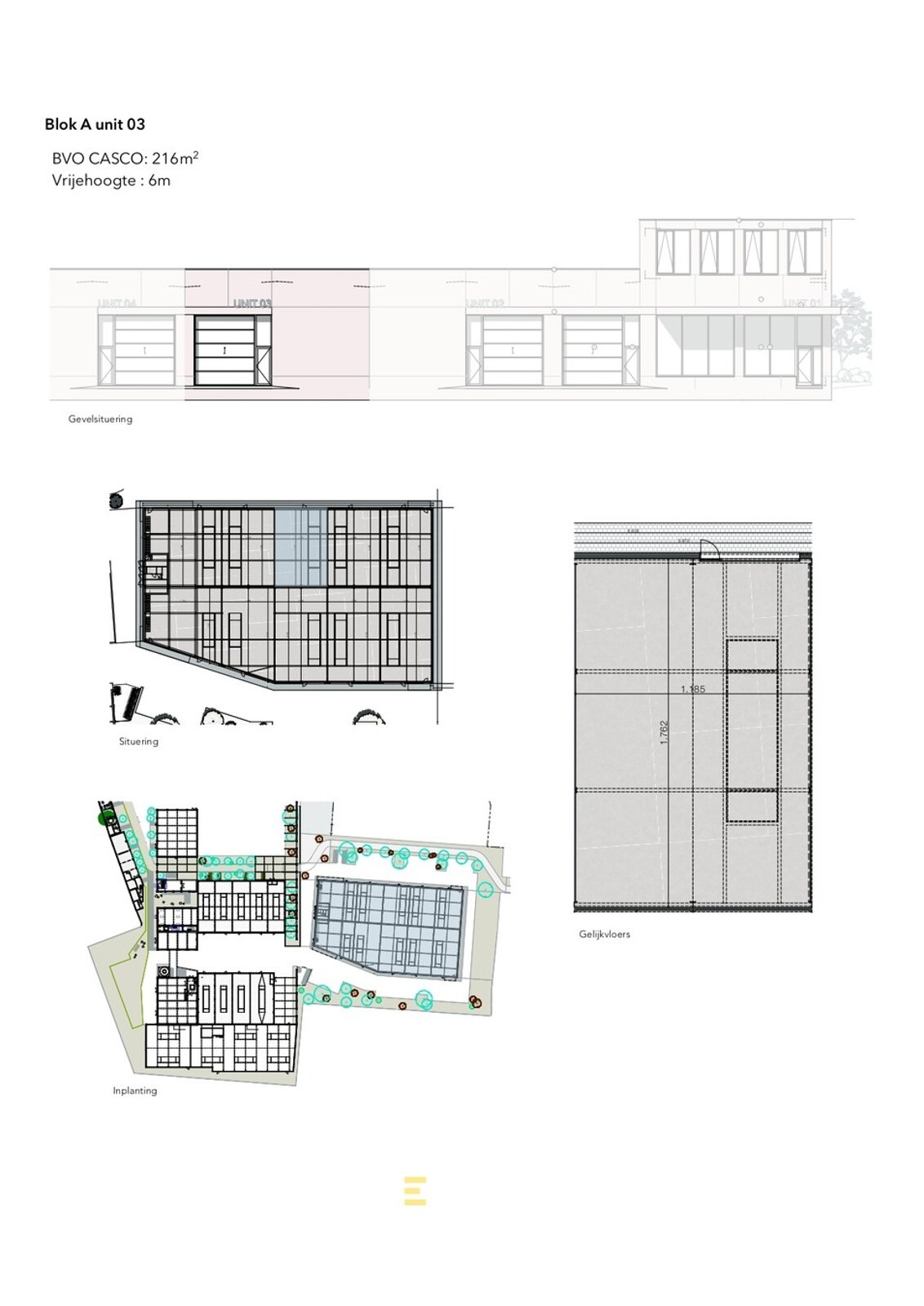 - Op de gevel is een plaats voorzien voor uniforme reclame van de verschillende bedrijven. Deze plaats is voor iedere loods uniform. De reclame op de gevel zal op kosten van de koper geplaatst worden.