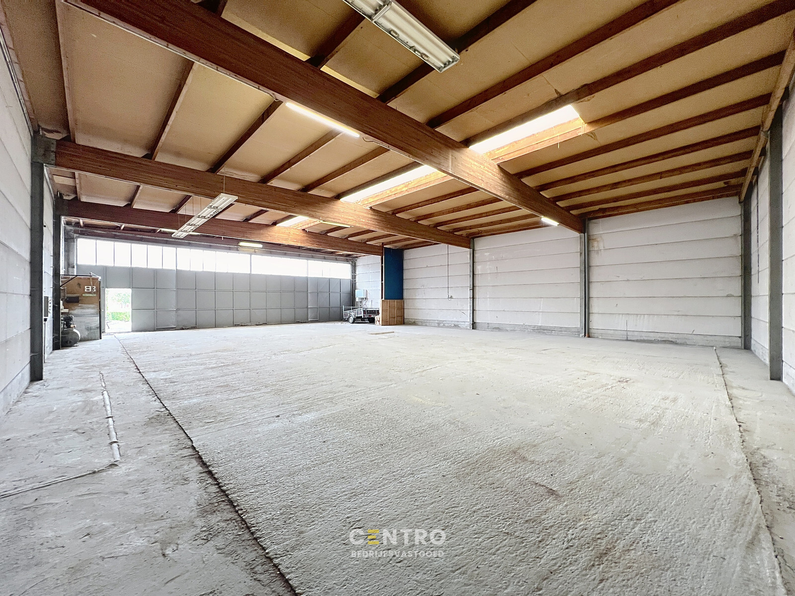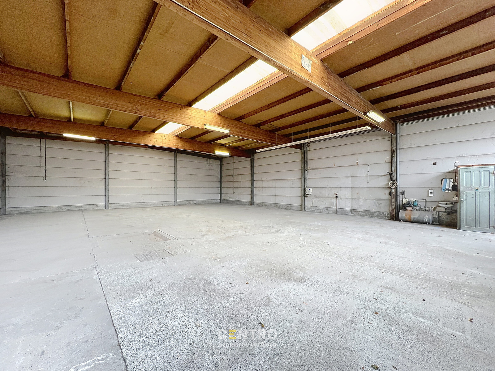 Metalen constructie (ca. 20m x 15m) met cellenbeton panelen, volledige houten overspanning (geen palen), geïsoleerd plat dak met centrale lichtstraat, betonvloer, schuifpoorten (h: 4,2m; b: tot 7m), buitenverlichting, hoogte 4,95m (vrije hoogte: 4m).