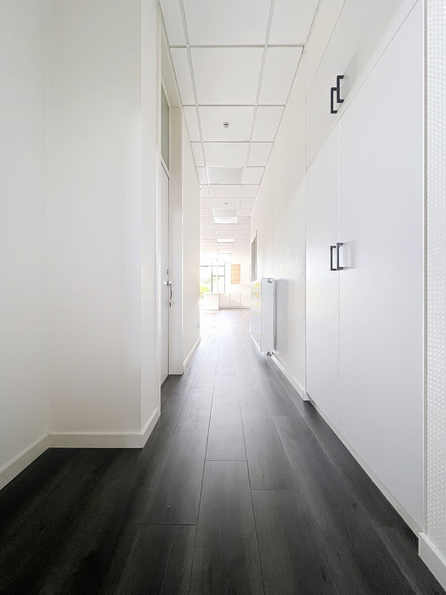 Inkomhal/wachtplaats – directiebureel – landschapsbureel/praktijkruimte – open keuken met kookeiland ( AEG: wasmachine, SIEMENS: vaatwasmachine, keramische kookplaat, dampkap, oven, frigo met diepvriesvak, dubbele spoelbak) - 3 aparte burelen (waarvan 2 met daglicht) - vestiaire - toilet met lavabo - omkleedruimte met inloopdouche en lavabo.