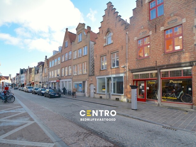 Gelijkvloers: Open ruimte met kitchenette en apart toilet. Gevelbreedte van 6m langs prominente Handelsstraat te Brugge.