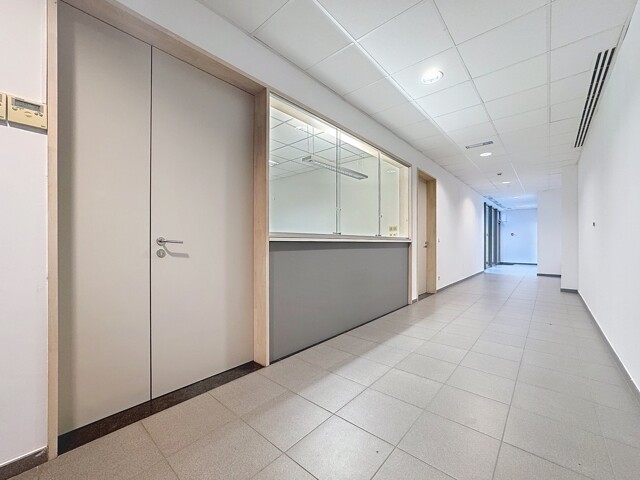 Bevloering met keramische tegels - grote glaspartijen (veel lichtinval) - verlaagd plafond met ingewerkte AIRCO-modules en TL-lampen - aluminium schrijnwerk met dubbele beglazing.