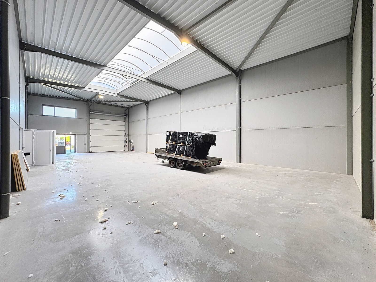 - Geïsoleerd plat dak bestaande uit geprofileerde staalplaten met centrale lichtstraat (3m x 12m, voorzien van meerwandige polycarbonaat platen), voorzien van rook -en warmteafvoer systeem).