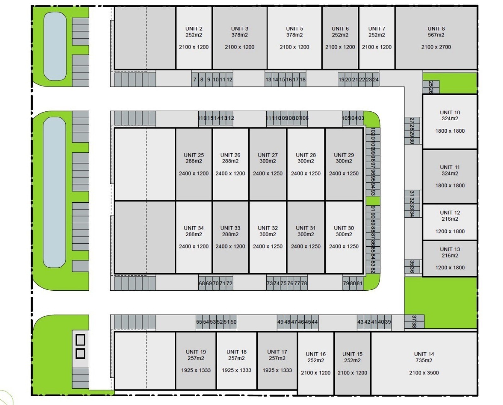12m x 24m + 3 parkeerplaatsen voor de deur.
