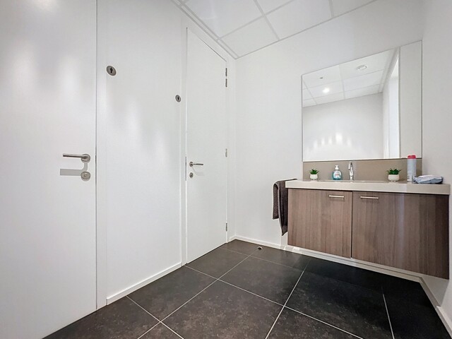Verlaagd plafond met ingewerkte LED-verlichting - muren bepleisterd en geschilderd - vast tapijt/keramische tegels - aluminium schrijnwerk met dubbele beglazing (bj. 2009) - mooie sanitaire ruimten voorzien van hangtoilet en lavabo.