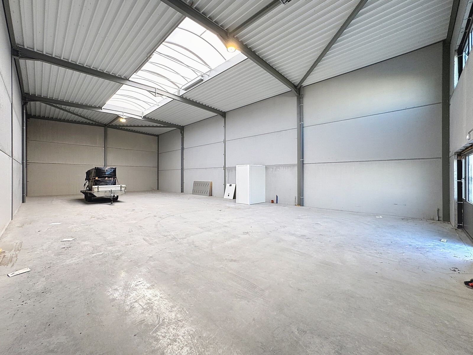 - Geïsoleerd plat dak bestaande uit geprofileerde staalplaten met centrale lichtstraat (3m x 12m, voorzien van meerwandige polycarbonaat platen), voorzien van rook -en warmteafvoer systeem).
