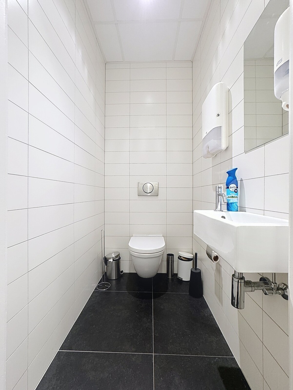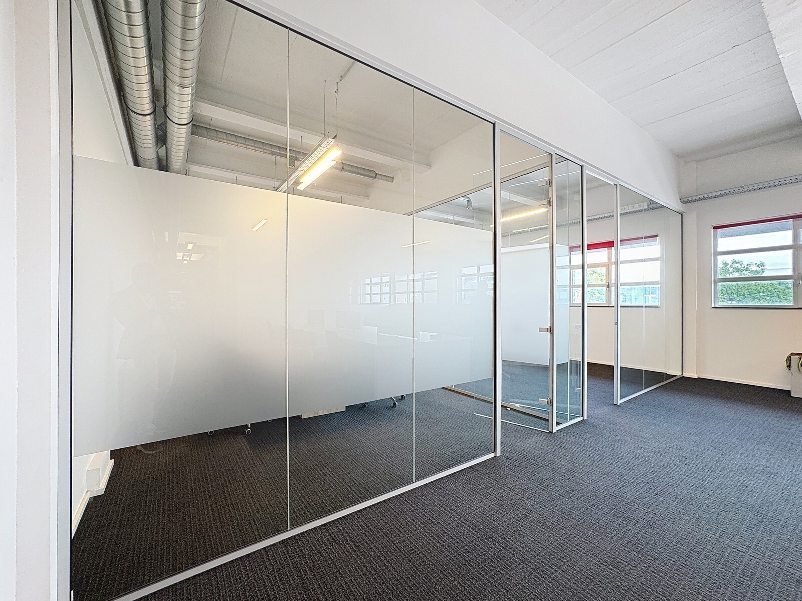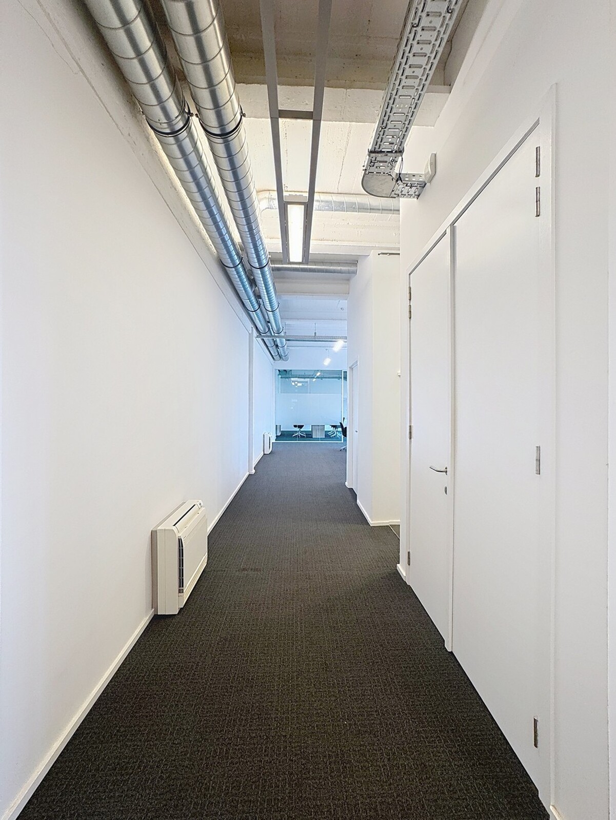 "Industrial look", zijnde betonnen constructie met zichtbare alu-buizen van het ventilatiesysteem en alu-kabelgoten - muren bepleisterd en geschilderd - vast tapijt - aluminium schrijnwerk met dubbele beglazing - mooie sanitaire ruimten voorzien van hangtoilet.