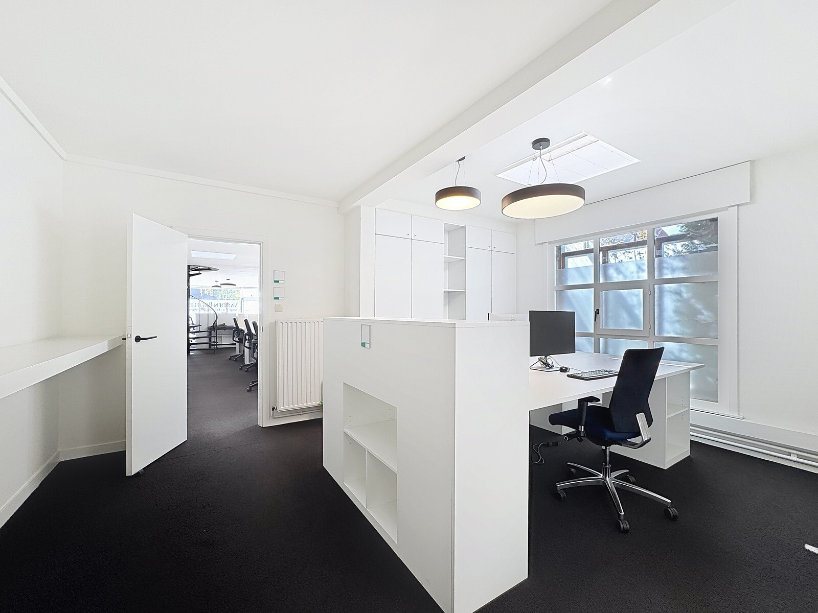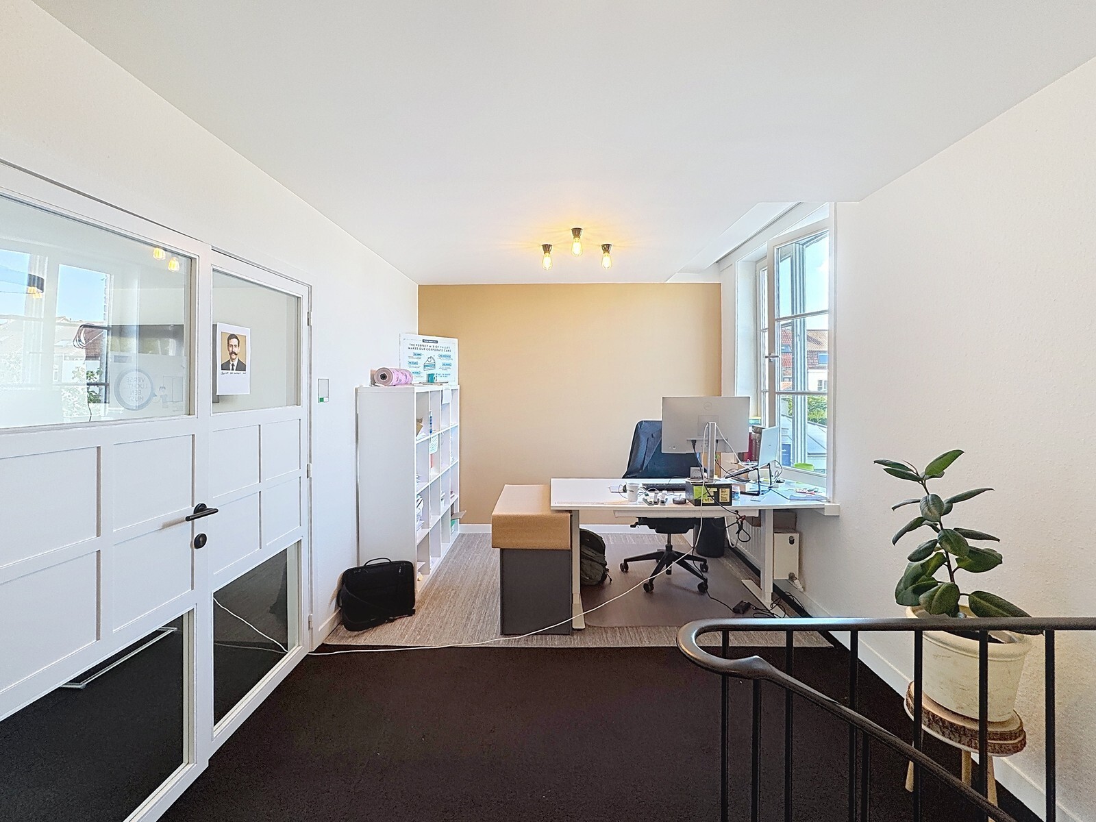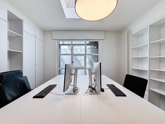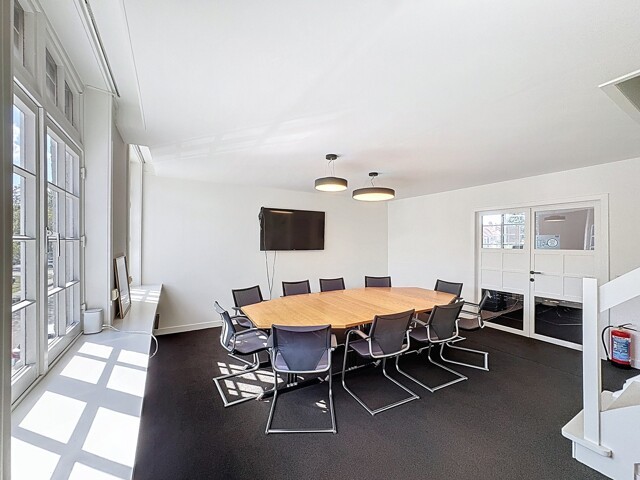 Eerste verdieping (± 50m²): Afzonderlijk bureel (1 werkplaats) - ruime vergaderzaal met trap naar de zolderverdieping.