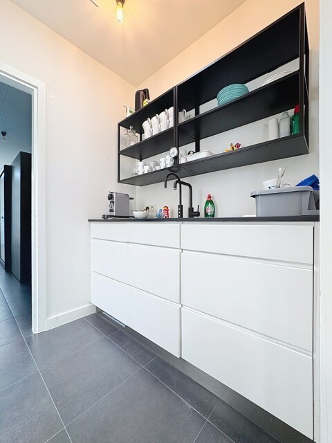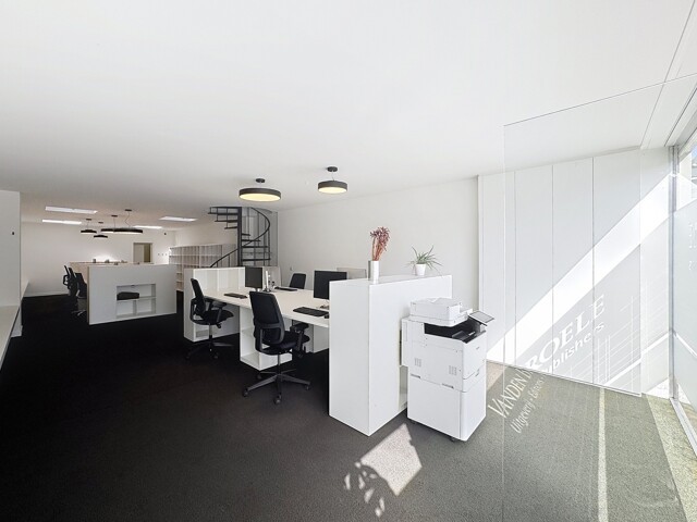 Gelijkvloers (± 175m²): Inkomhal met landschapsbureel (10 werkplaatsen) - afzonderlijk bureel (2 werkplaatsen) - keuken met wastafel, frigo en vaatwasser - sanitair met lavabo - berging (serverlokaal).