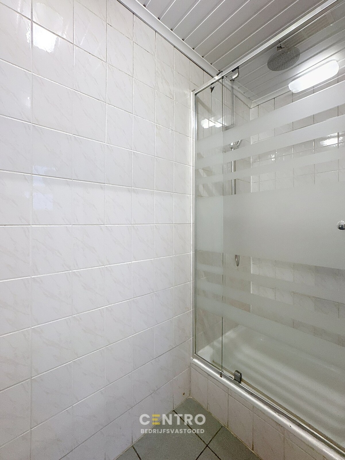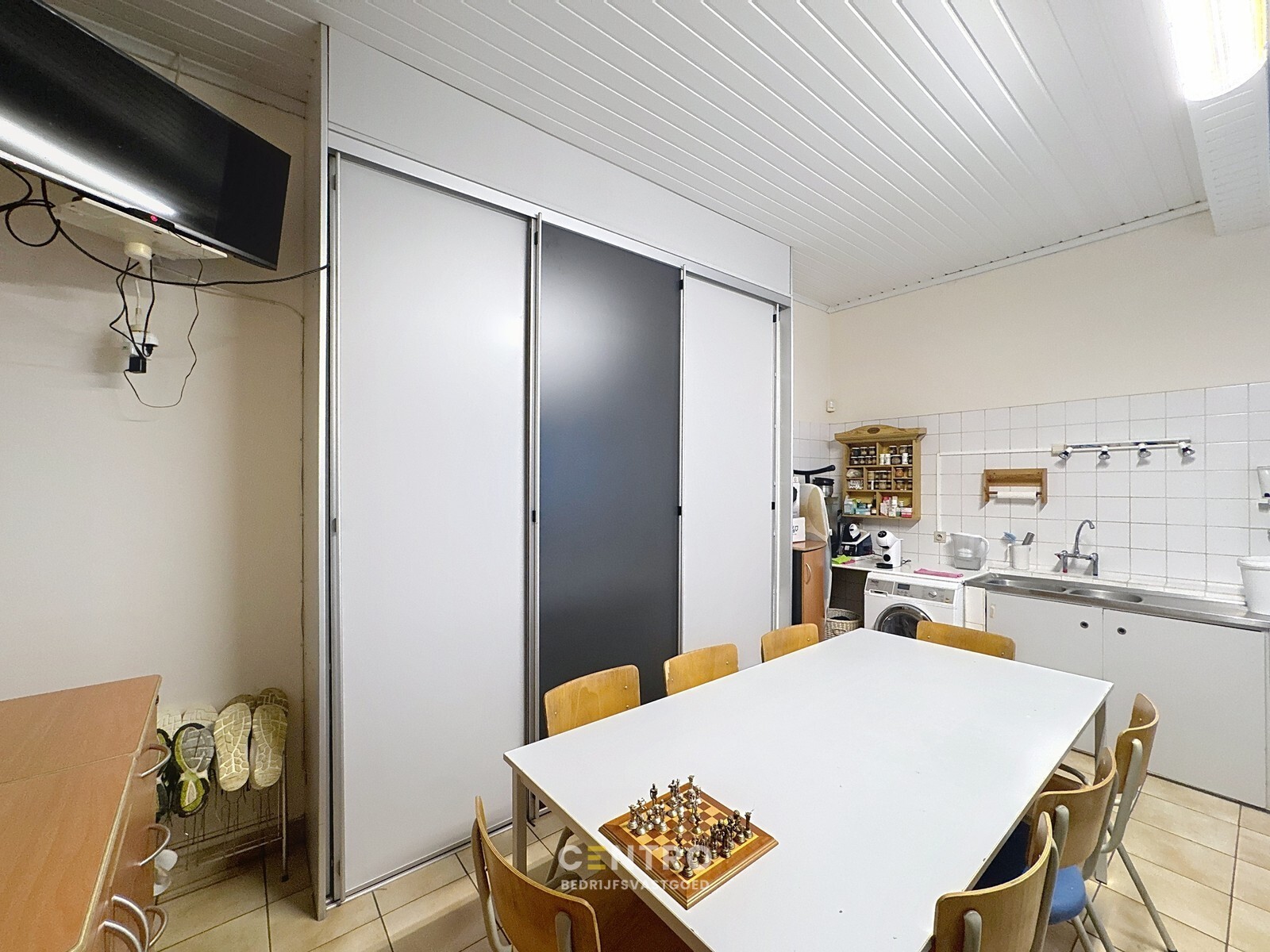 Afzonderlijke dames- en herentoiletten met doucheruimte en 2 wastafels - bureelruimte met open keuken.