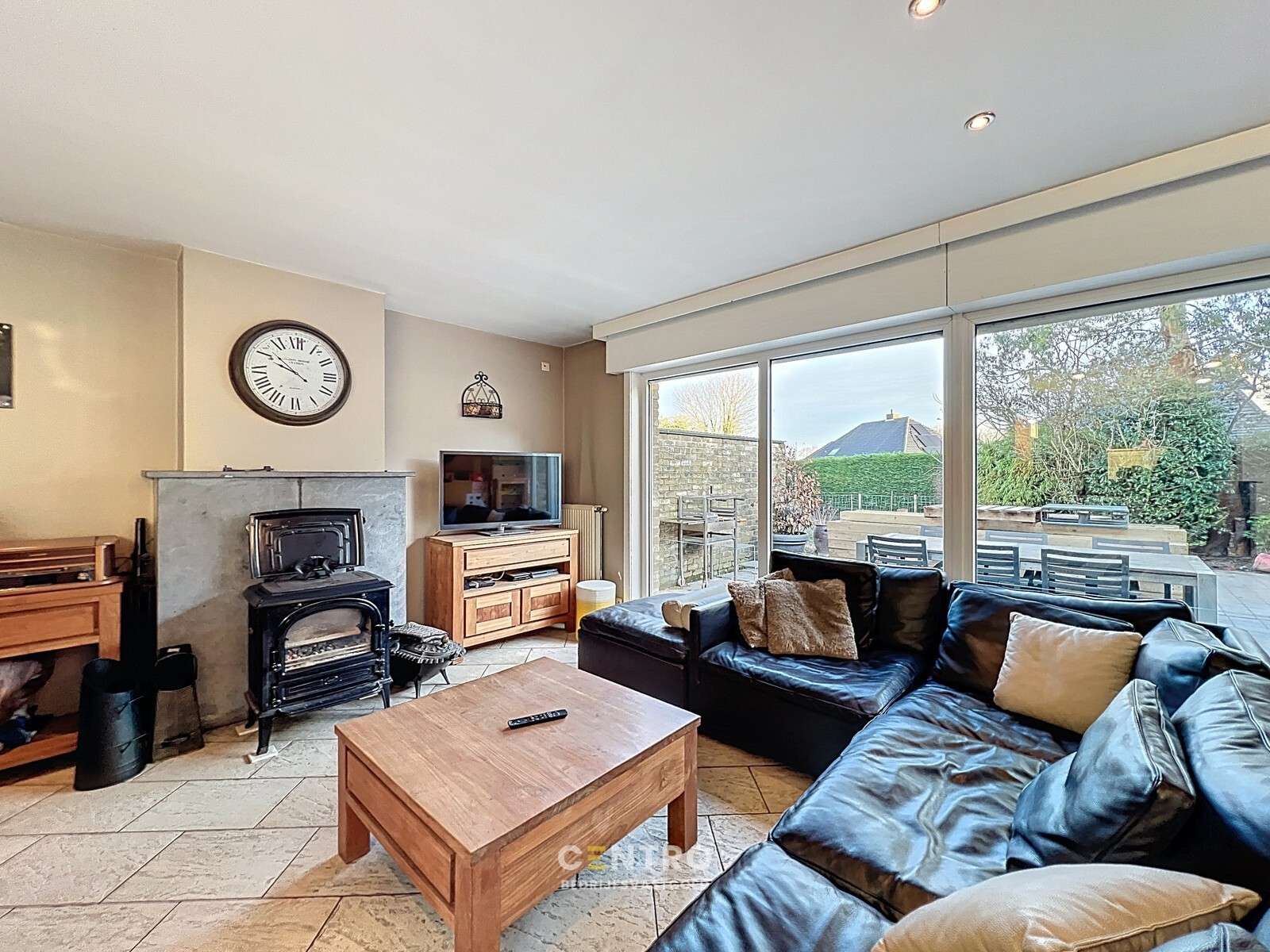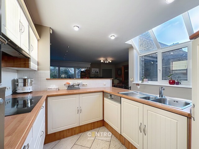 Gelijkvloers: keuken (voorzien van alle toestellen) met eiland en aansluitende ontbijthoek – wasplaats met aansluitingen W+D – bergruimte – badkamer (bad, lavabomeubel, aparte boiler 150L) – toilet – patio (met aparte inkomdeur) – ruime rechthoekige zit-en eethoek – hall - garagegebouw ( 2 wagens + extra overdekte ruimte) toegankelijk via de woning - tuin met terras en tuinberging.