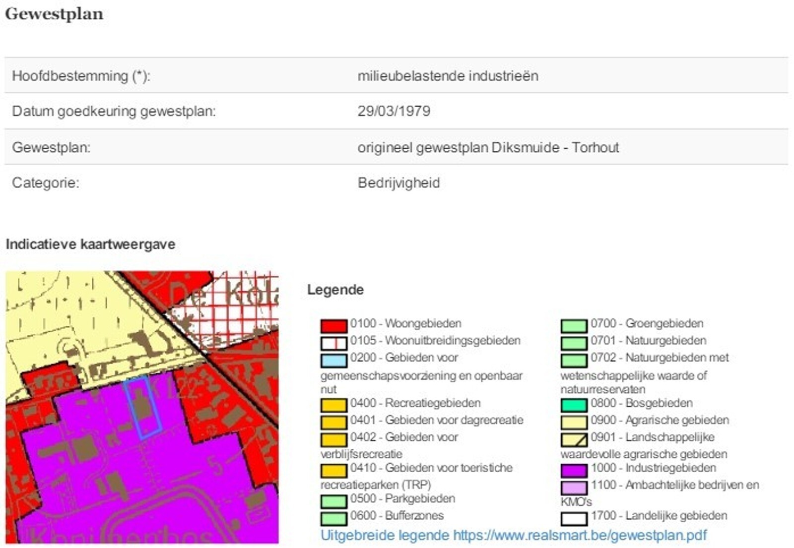 Volgens het gewestplan gelegen op "industriezone": productie, nijverheid, opslag, groothandel (B2B) met nevenactiviteiten. Geen HORECA of kleinhandel mogelijk als hoofdactiviteit!