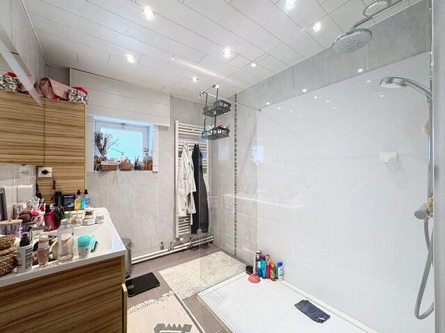 Woongedeelte: afzonderlijke inkom via de rechter zijgevel met gastentoilet - lichtrijke leefruimte met eetplaats en veranda - 4 ruime slaapkamers - badkamer (dubbele wastafel, inloopdouche en ligbad) - zonnige tuin met terrassen.