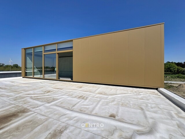 Casco kantoorruimte met mogelijkheid tot ruim dakterras van 100m² - gevel in bronskleurige bardage - grote raampartij met hefschuifraam.