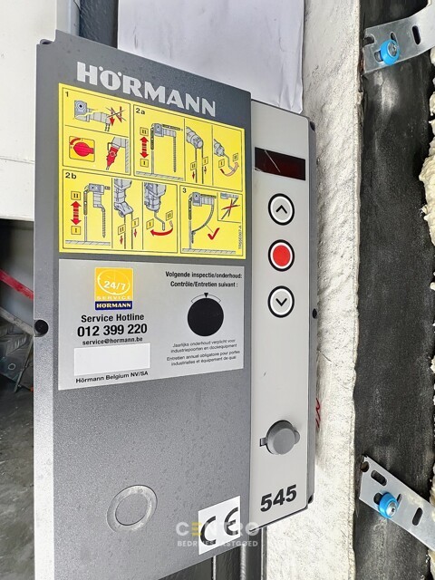 - Deuren en poorten: sectionaalpoort Hörmann (b: 4m x h: 4,5m) met afzonderlijke loopdeur en bovenlicht, glazen deur achteraan
