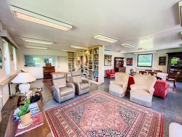 Eerste verdieping (± 190 m2): traphal met toilet - open, lichtrijk landschapsbureel (± 80 m2), 3 afzonderlijke kamers (10 + 15 + 20 m2) - gang - polyvalente ruimte (50 m2) met hoogte tot in de nok - CV-lokaal met nieuwe hoogrendementsketel van het merk "Buderus" en grote warm-water boiler.