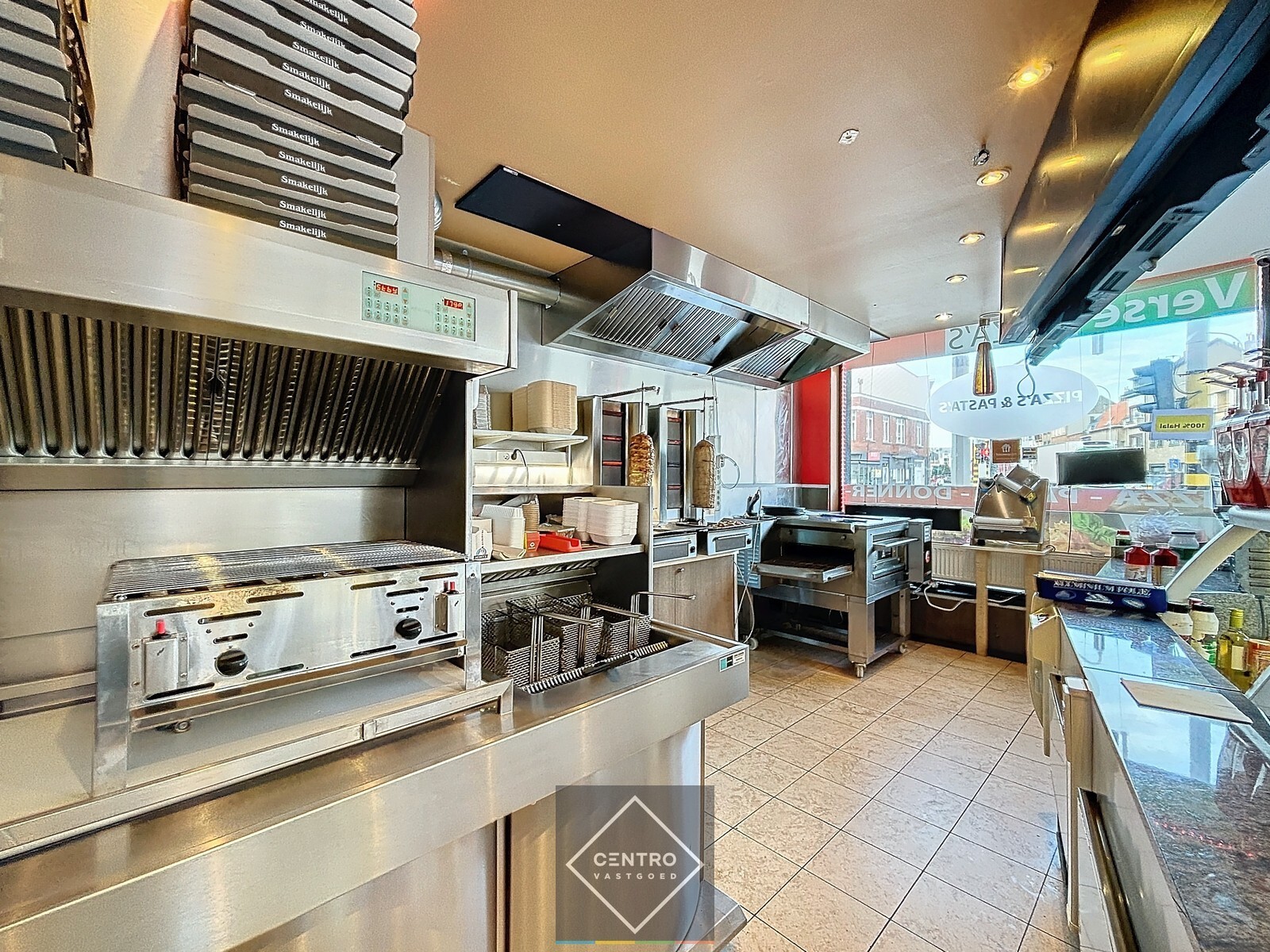 Inkom - handelgelijkvloers (heden ingericht als eethuis / ALLE TOESTELLEN en MEUBILAIR BLIJVEN STAAN!) - bureel - berging - koelcellen - afzonderlijk gastentoiletten - garage.