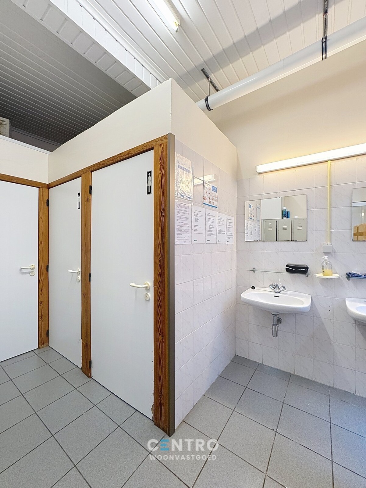 Afzonderlijke dames- en herentoiletten met doucheruimte en 2 wastafels - bureelruimte met open keuken.