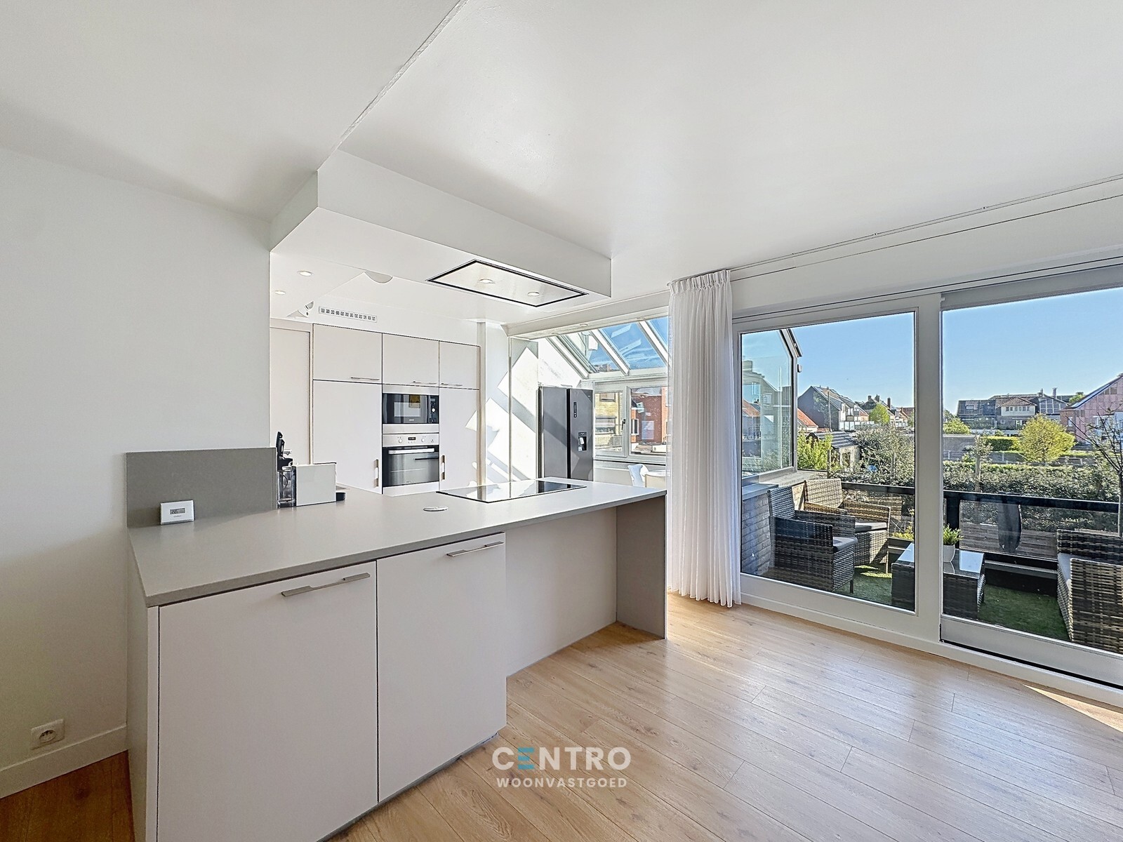 Hal - lichtrijke living (met houtcassette) - volledig ingerichte recente 'Dovy'-keuken (O.a. met inductiefornuis, dampkap, ingebouwde microgolfoven, combi-oven én vaatwasmachine) - zonneterras.
